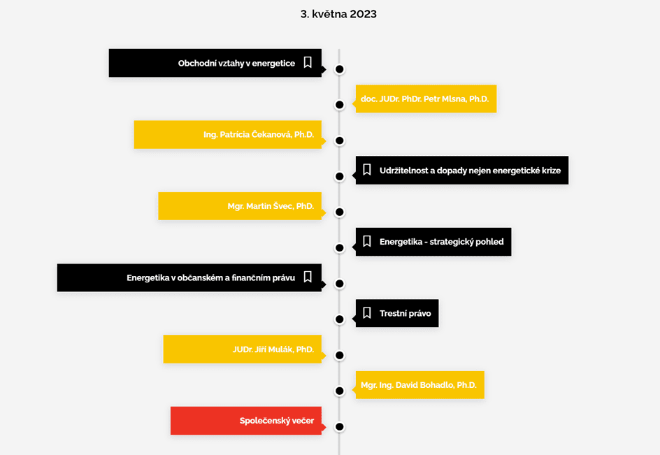 První den akce bude věnovaný tématu energetiky v právních souvislostech, druhý den bude patřit aktuálním otázkám v advokacii a justici. K tématu energetiky tak zazní mimo jiné příspěvky z oblasti hospodářské soutěže, veřejných zakázek a veřejné podpory (doc. JUDr. PhDr. Mlsna, Ph.D.); komunitní energetiky (Ing. Čekanová); souvisejících mezinárodních aspektů (Mgr. Švec, PhD.); energetické udržitelnosti a ESG; strategického očekávání v oblasti energetiky; smluvní agendy a financování (JUDr. Kadlec) až po trestní aspekty této oblasti (JUDr. Mulák, Mgr. Bohadlo, PhD.). Druhý den kongresu bude věnován aktuálním problémům advokacie, srovnání se zahraničím či elektronizaci (Mgr. et Mgr. Vávra, JUDr. Maisner, Ph.D., MCIArB.). Chybět nebude ani již tradiční justiční blok (JUDr. Jirsa, JUDr. PhDr. Šimka, Ph.D., JUDr. Šuk, JUDr. Vávra).