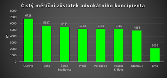 Začínající koncipient v Brně bude končit měsíc s finančním zůstatkem na účtu kolem 2.000,- Kč. Oproti tomu ve stejném složení žebříčku výdajů se má advokátní koncipient v Ostravě více jak 3x lépe a jeho měsíční čistý zůstatek dosahuje cca 6.700,- Kč. Nutno podotknout, že Brno je taženo směrem dolů v rámci životní úrovně především cenami nájmů, kdy je hned na druhé příčce za Prahou a ceny jsou podstatně výše nežli ve zbylých porovnávaných městech, ovšem průměrné nástupní mzdy advokátních koncipientů jsou téměř srovnatelné. V Brně je také navíc jedna z nejvyšších koncentrací advokátních koncipientů v přepočtu na advokáta i na obyvatele v porovnání s jinými městy a zdaleka zde není tak bonitní klientela ani kupní síla jako je tomu v Praze.