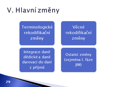Teď se zase vracím na počátek svého vystoupení, proč je daňové právo provázáno se soukromým právem. Na začátku příprav přizpůsobení daňových zákonů rekodifikaci soukromého práva bylo nutné zvolit, jakým způsobem k tomuto přizpůsobení přistoupit. Fakticky se nabízela tato tři pojetí: striktně věcně rekodifikační, věcné a terminologické rekodifikační pojetí a navazující věcné a terminologické změny. Bylo zvoleno to třetí pojetí a já se Vám pokusím vysvětlit proč.