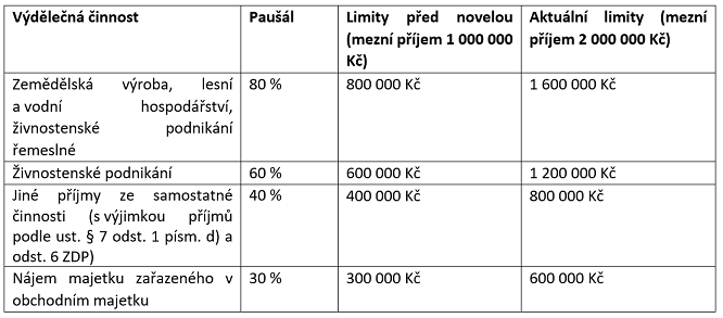 Oproti loňskému roku se mezní příjem pro uplatnění výdajových paušálů zdvojnásobil, a to z 1 milionu na 2 miliony korun. Nezměněná zůstává velikost uplatnitelných paušálů v procentuálním vyjádření v rozmezí 40 % až 80 %.