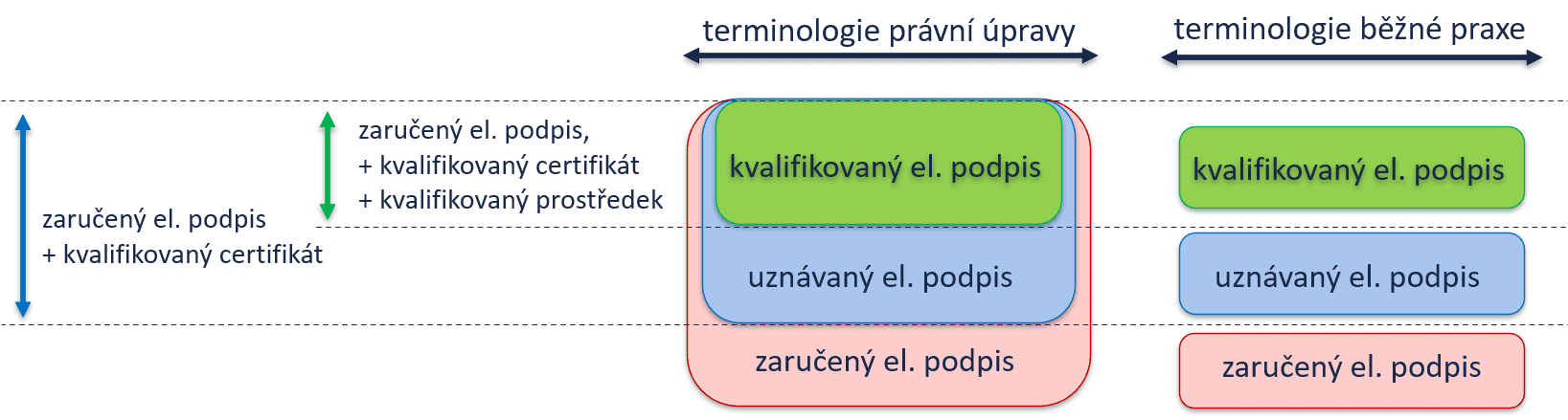 Naproti tomu právní úprava chápe stejné pojmy jako „do sebe vnořené“ pojmové kategorie: kvalifikovaný elektronický podpis je pro právo současně také uznávaným elektronickým podpisem, a současně i zaručeným elektronickým podpisem. Připomeňme si tento rozdíl na následujícím obrázku: vlevo a uprostřed je pohled právní úpravy, vpravo pohled běžné praxe.