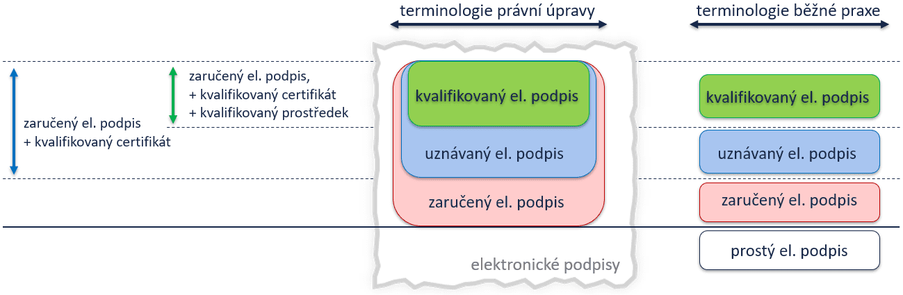 Již z principu proto mezi elektronické podpisy (coby definici a generické označení) a tzv. prosté elektronické podpisy (coby konkrétní druh elektronických podpisů) nemůžeme klást rovnítko. Byť se s tím v různých právních textech můžeme takto setkat: