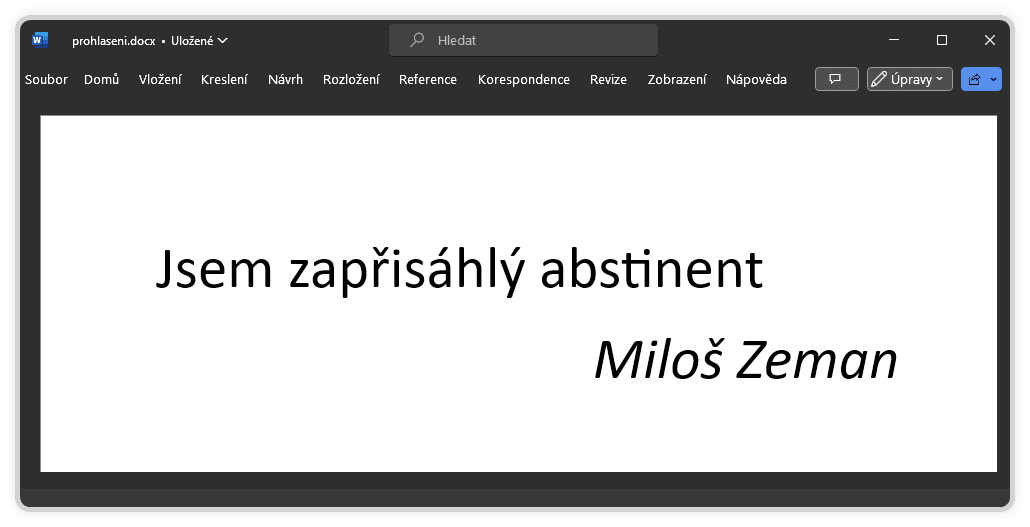 Zkusme si (ne)splnění jednotlivých požadavků, kladených na zaručené elektronické podpisy, rozebrat na typických příkladech toho, co bývá v praxi také považováno za prostý elektronický podpis. Může to být například jen něčí jméno a příjmení, napsané v nějakém editoru, jako na následujícím obrázku: