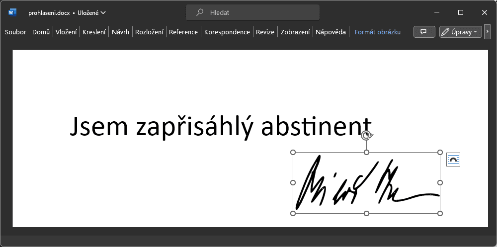 S (ne)splněním podmínek je to u tohoto „obrázkového“ podpisu vlastně úplně stejné jako u „textového“ podpisu z předchozího obrázku: koho bychom měli považovat za podepsanou osobu? Toho, kdo podpis vytvořil (tím, že obrázek vložil do dokumentu)? Nebo toho, koho si spojujeme s obsahem samotného obrázku? A co kdyby místo obrázku s křivkou vlastnoručního podpisu byl takto vložen do dokumentu nějaký „neadresný“ obrázek? Třeba smajlík, sluníčko, domeček apod.?