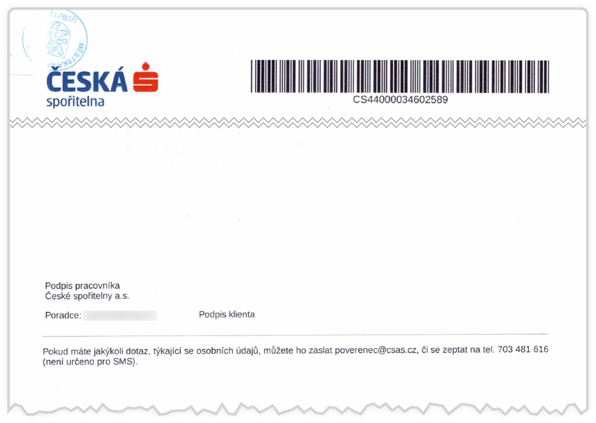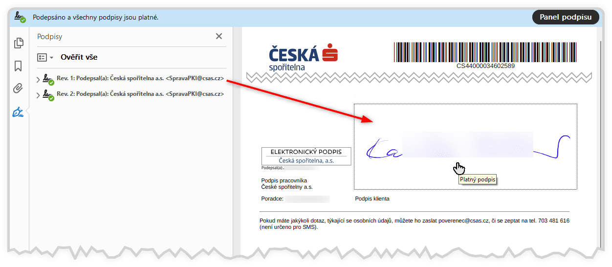 Příklad ukazuje následující obrázek dvoustranného smluvního dokumentu, který je opatřen dvěma pečetěmi druhé smluvní strany. S tím že podpis první strany (fyzické osoby – klienta), resp. obrázek s křivkou jeho podpisu, je zde využit pouze v roli vizualizace první z obou pečetí.