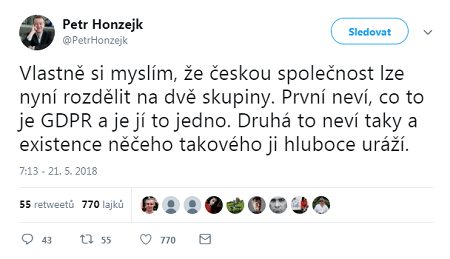 S blížícím se jarem 2018 sílil v českém rybníčku právního povědomí nevídaný malstróm. Václav Klaus mladší přidal další položku na svůj nekonečný seznam důvodů, proč okamžitě opustit Unii, a dokonce i Michael Třeštík, jenž jindy publikuje veselé a povzbudivé příspěvky, pod vlivem souvisejícího školení psal o zhoubě lidstva. Dne 25. května totiž vstoupilo v účinnost GDPR, obecné nařízení o ochraně osobních údajů.