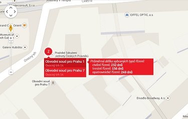 Otázku „Jak dlouho ještě bude řízení trvat?“ od svých klientů slyšel snad každý advokát. V naší advokátní kanceláři nejsme výjimkou a rovněž se častokrát setkáváme s průtahy v řízeních našich klientů zapříčiněných liknavým jednáním soudů. Právě proto jsme se rozhodli na výše položenou otázku odpovědět. Vytvořili jsme „Mapu průtahů“, jejímž cílem je poskytnout nejen našim klientům, ale i široké veřejnosti, základní informace o průměrné délce vybraných typů soudních řízení a dát jim tak možnost dopředu zjistit „do čeho jdou“. Mapa zobrazuje průměrné délky vybraných typů soudních řízení (ode dne nápadu do dne právní moci rozhodnutí) pravomocně skončených v roce 2013. Mapka nabízí velice snadnou orientaci a možnost výběru prvostupňového soudu, u něhož předmětný typ soudního řízení probíhá. Umožňuje rychle a spolehlivě zjistit, jak dlouho na příslušném soudě v průměru trvají typově obdobná soudní řízení.