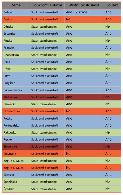 Příkladem z druhé strany jsou pak pouze Maďarsko a již zmíněné Slovensko, které jsou nyní jedinými dvěma státy, které mají striktně danou teritorialitu bez možnosti výběru exekutora a zároveň tam exekutoři fungují jako podnikatelé. Bohužel ani z jedné z těchto zemí zatím nemáme dostatek dat, která by jasně mluvila pro zavedení tohoto systému. Podle posledních zpráv od věřitelů ze Slovenska tam však situace není dobrá a změna se velmi negativně promítání do úrovně vymahatelnosti.