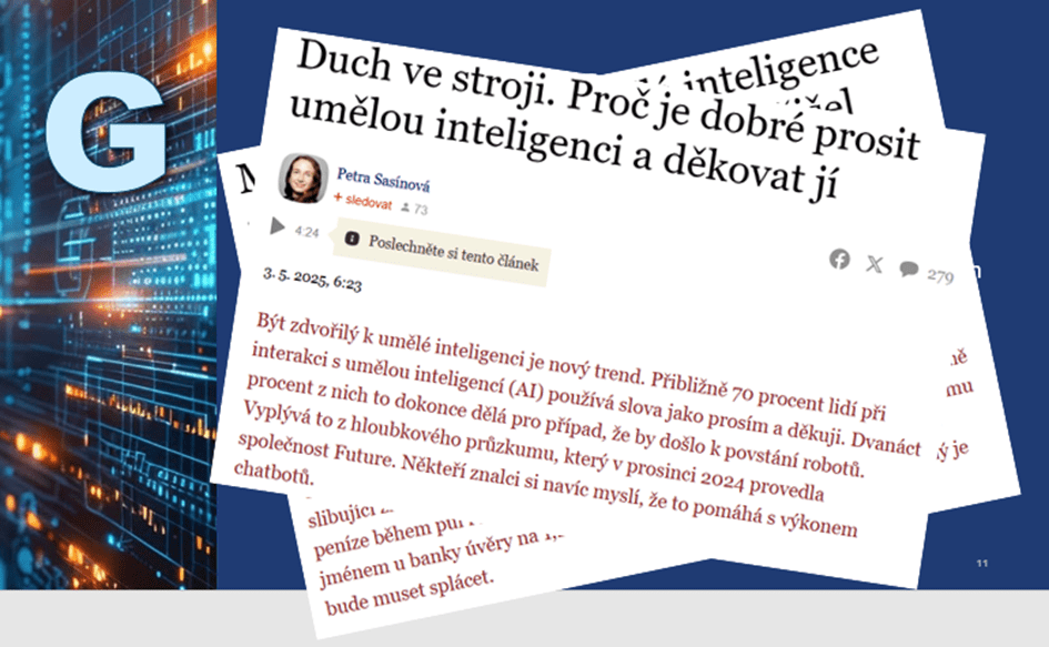Zároveň existuje celá řada různých mýtů, které souvisí s používáním AI. Mně se hrozně líbil titulek „Duch ve stroji“. Když se podíváte do toho, o čem ten článek je, rozebírá takový ten fenomén, zdali máte umělé inteligenci poděkovat a být na ní slušný, nebo máte být sprostí a úseční.