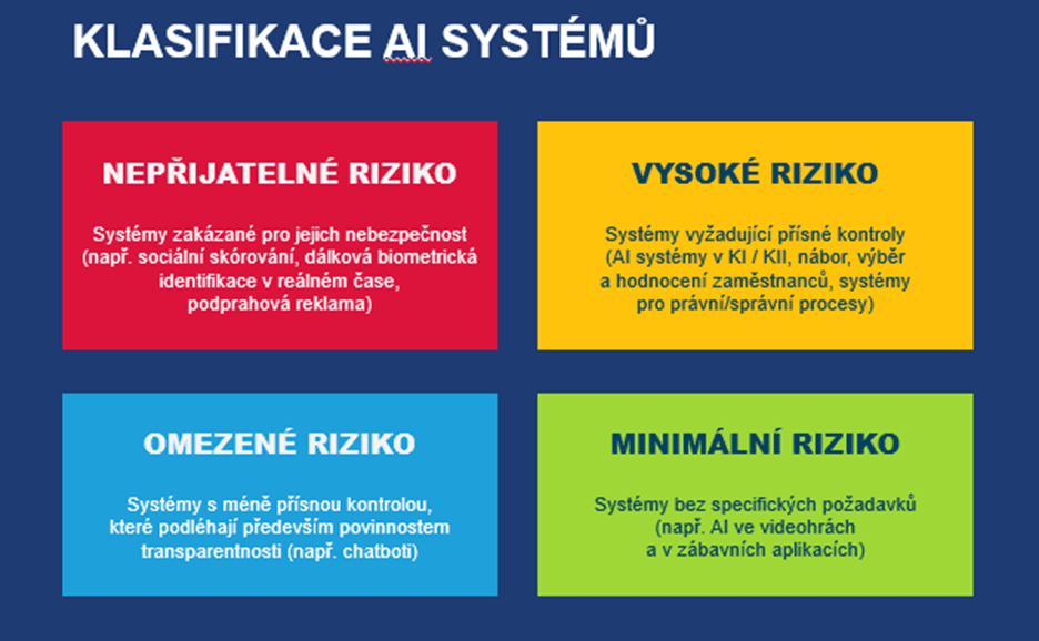 Dostáváme se k písmenu K, tj. ke klasifikaci AI systémů. AI Act pracuje s několika kategoriemi, v zásadě jsou čtyři.