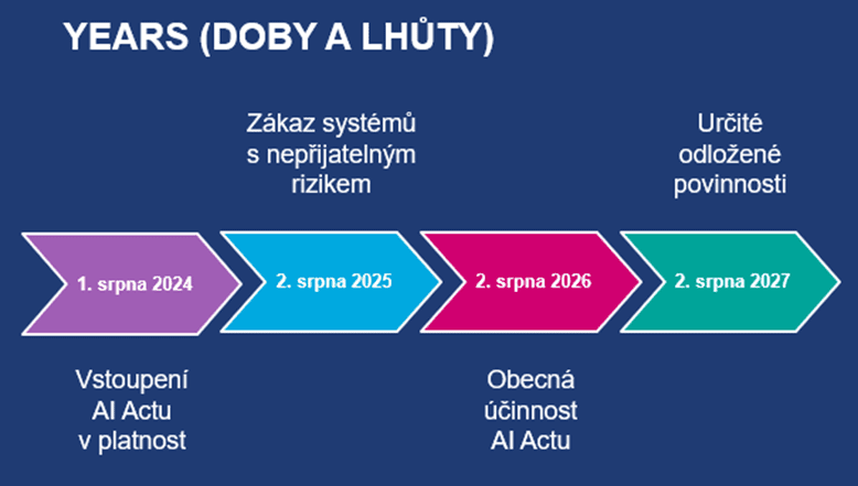 Jak je to tedy s účinností. A tady máme v obrázku chybu, je tam 2. srpna 25 – zákaz systémů s nepřijatelnými riziky, a má tam být únor. Takže od 2. února 2025 platí zákaz systémů s nepřijatelným rizikem. Obecná účinnost AI Actu nastane až příští rok, to pro vás bude primárně znamenat ty povinnosti v oblasti používání vysoce rizikových systémů.