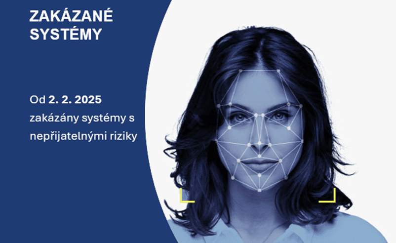 Zakázané systémy jsou ty s nepřijatelným rizikem, a to od 2. 2. 2025. Výše vidíte obrázek, který představuje výstup z jednoho z takových zakázaných systémů. Jednalo se o Clearview, který byl dokonce zakázán ve Spojených státech, a to z důvodu ochrany soukromí. Fungoval tak, že když bych si někoho vyfotil a nahrál ho do Clearview, systém by fotku proscreenoval v režimu online sociálních sítí a dalších dat a řekl by mi jméno. A přesně takovýhle systém je nepřijatelný.