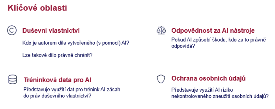 Umělá inteligence jako nová technologie, ale mohou to být samozřejmě i jakékoliv další, které se z ní budou odvozovat nebo přijdou následně, tak nám tento koncept a tuto jistotu trošku narušují a jedním z hlavních témat je autorství. Je to zejména o trénování modelů a trénování nástrojů na duševním vlastnictví někoho třetího, ať už jde o obrázky, jde o hudbu nebo jde o texty jako takové.