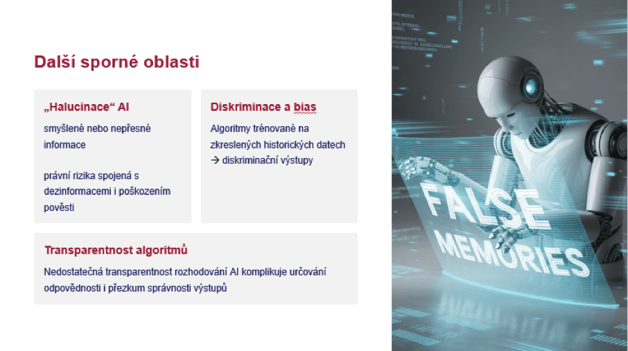 Možná jste zaznamenali i to, že tady máme nejen velké oblasti klíčové, ale vlastně jak ti, kteří umělou inteligenci využívají, tak ti, kteří ji budují, tak ti, kteří o ní rozhodují, se setkávají i s některými z těchto, řekněme, fenoménů, ať už je to halucinace umělé inteligence, diskriminace nebo zkreslování, diskriminační výstupy, popřípadě i transparentnost rozhodování nebo procesu, jak vlastně vzniká určitý výstup na základě nějakého pokynu, který do umělé inteligence dáte. To jsou bezesporu věci, které zatím nezmizely, které se možná redukují. Výrobci řešení, věřím, jsou si těchto sporných oblastí vědomi a snaží se maximálním způsobem, tak jak to je samozřejmě shodné s předmětem jejich podnikání, tyto sporné oblasti odbourávat. Ale pokud někdo říká, že před rokem zadal něco do umělé inteligence, ta si vymyslela s prominutím nějakou hloupost, a proto jí nevěří, tak tento přístup je opravdu potřeba revidovat prakticky každý týden, protože se ty nástroje, jak jsem říkal, opravdu velmi zlepšují a to, co platilo včera, už občas neplatí dnes, minimálně v těch jejích dovednostech.