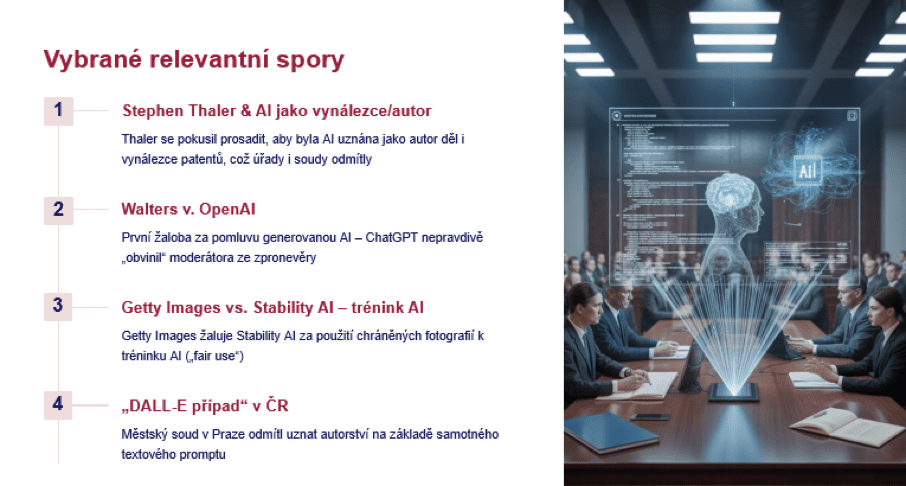 A poslední případ je ten z České republiky ohledně vygenerování obrázku na základě jednoduchého promptu. Já mám za to, že ten případ byl opravdu jenom takovou pokusnou vlaštovkou, kterou vypustili advokáti k tomu, aby zjistili nějaký prvotní názor českého soudnictví na to, jak si vykládá v kontextu umělé inteligence autorství a jestli ten osobní tvůrčí přínos fyzické osoby, který se předpokládá u autorského díla, tak jestli u tohoto rozhodnutí městského soudu z roku 2023 si ho i v kontextu AI vykládá tak, že prostě nikdo jiný než fyzická osoba nemůže být autorem. Toto rozhodnutí velmi jednoduše říká ano, AI nemůže být autorem, ale samozřejmě nezavírá dveře k tomu, že by se s využitím umělé inteligence jako čistě nástroje dalo dospět i k tomu, že ten, kdo zadává a dobře instruuje ten nástroj, by mohl za určitých okolností být jako autor uznán. Ale je to nějaká úvaha, kterou rozvádějí případy spíš zahraniční, kde už se k podobným závěrům dospělo. Myslím si, že u nás opět nebude o tomto příliš velká diskuze a nikdo se o toto nebude chtít soudit. Takže ani zde si nemyslím, že by české soudy čekalo nějaké velké rozhodování.