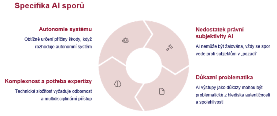Samotná autonomie toho systému a to obtížné určování příčiny škody v rámci fungování těchto systémů i nesení konkrétních povinností bude jedním ze specifik, které budou oproti běžným technologickým sporům hodně odlišné. To, že sama o sobě vlastně ta technologie nemůže být žalována, je asi stejné, jako že nemůžete žalovat CRM za to, že vám dalo špatný kontakt na vašeho klienta. Spor vždycky vedete vůči někomu, kdo je v pozadí toho systému, ale zase máme tady relativně velký rozpad těch odpovědností mezi poskytovatele, mezi toho, kdo to řešení nasazuje, mezi distributory, mezi dodavatele, mezi samotné osoby, které ten systém používají. Takže opět tady to bude velmi specifické, pokud se o tomto bude rozhodovat v nějakém větším detailu.