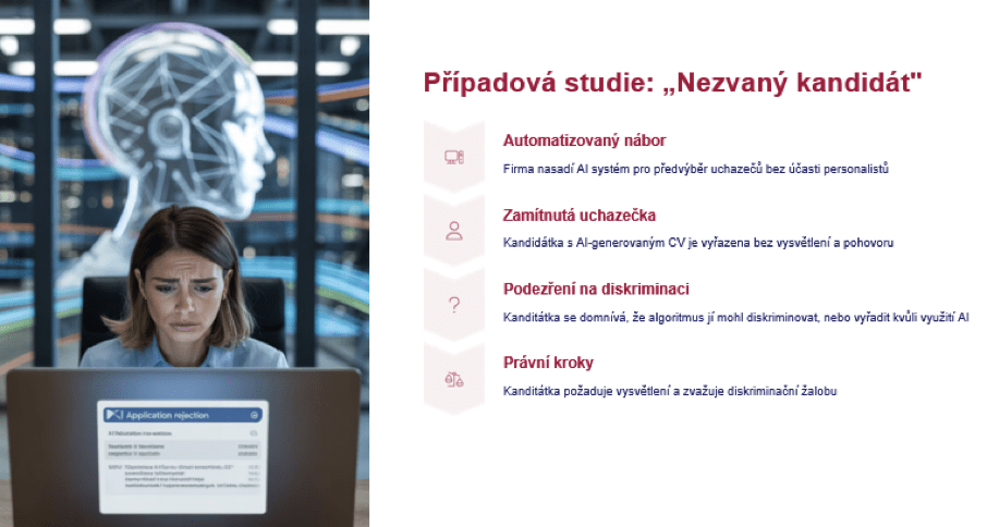 Říkal jsem si, že by nebylo špatné si možná vzít nějaký příklad. Nazval jsem to studií, ale je to v podstatě vymyšlený příklad toho, co by se mohlo stát, kdyby se propojilo několik regulací dohromady na nějakém relativně jednoduše pochopitelném případu. Nebylo by špatné si to ukázat třeba na tom, když firma nasazuje automatický nábor svých zaměstnanců nebo minimálně nasadí systém pro předvýběr uchazečů bez účasti personalistů, protože odhaduje se, že přes 90 % firem v žebříčku Fortune 500 využívá umělou inteligenci při rozhodování v náboru. Já bych možná nebyl tak optimistický, ale i kdyby to bylo 85 nebo 80 %, tak to je opravdu významné. Některé, například Amazon, už za to byly pokutovány a samy zjistily, že principy, které zavedly, nejsou úplně správné a vedou k diskriminaci. Nicméně pojďme si tento příklad představit: firma má systém na předvýběr uchazečů. Ozve se jí zamítnutá kandidátka, která si svoje CV-čko vygenerovala také prostřednictvím umělé inteligence a je vyřazena bez vysvětlení a bez pohovoru. A podezřívá samozřejmě tu společnost, kam poslala to CV-čko a kde opravdu chtěla být, že ji diskriminovali, že ji vlastně vyřadili s využitím umělé inteligence, aniž by se na to někdo z personalistů podíval. Myslím si, že to není úplně daleko od reality i v některých firmách v České republice. A zvažuje další právní kroky, požaduje vysvětlení a snaží se vymyslet způsob, jak se dobrat k informacím a k tomu, jestli náhodou nemohla být diskriminována a nemohla by z toho něco vysoudit.