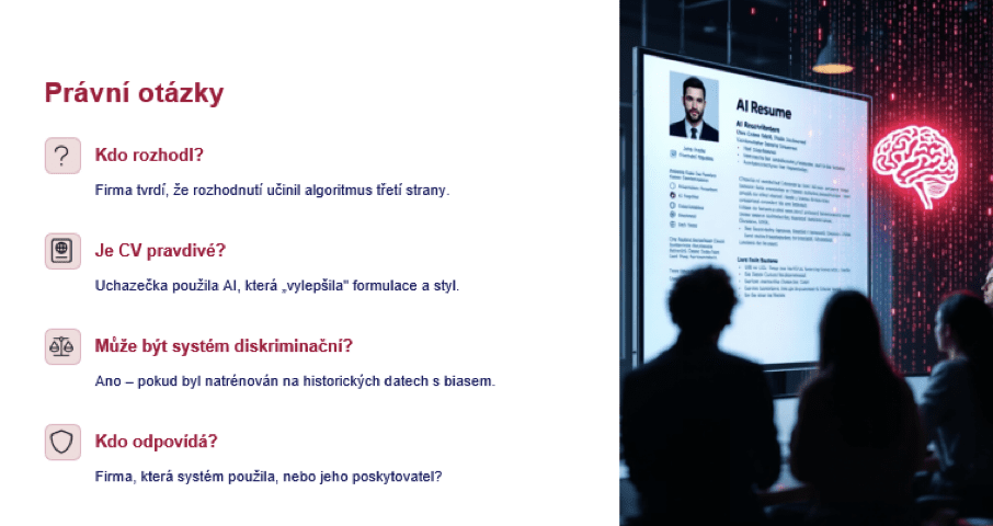 Kdo vlastně rozhodoval na straně té společnosti, může být jedna z těch otázek. Protože firma bude tvrdit, že si koupila řešení od třetí osoby. Ta jí řekla, že řešení je plně v souladu s AI Actem, že k tomu dostanou příručku, že jim to vysvětlí, a tím pádem, že to můžou v klidu používat. Jestli splnili nebo nesplnili všechno, co jim AI Act bude předepisovat od příštího roku pro vysoce rizikové systémy, bych teď nechal stranou. Zároveň bychom tady ale měli to, že již dnes existuje víc než 10 mně známých služeb, které jsou schopné na základě změny inzerátu vytvořit motivační dopis, který je opravdu velmi přiléhavý v jakémkoliv světovém jazyce a dokážou upravit životopis tak, aby opravdu odpovídal tomu, co se v tom popisu pozice chce. To znamená, že i dnes (a nejen ve světě, ale věřím, že i u nás je k tomu řada různých zdrojů, které navádí, jak to dělat) jsme opravdu tady v podstatě při souboji nějakého AI vůči AI. Jestli se můžeme bavit o diskriminaci nebo jestli je tohle férové, kdo odpovídá za to, jestli zpracování bylo nebo nebylo v souladu s výkladovým rámcem.