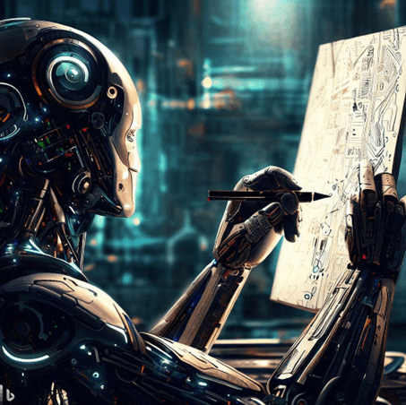 Níže můžete vidět příklad obrázku vygenerovaného umělou inteligencí, konkrétně prostřednictvím Bing Image Creator od společnosti Microsoft[14], a to na základě mého textového pokynu: „Nakresli kyborga, který maluje obraz“.