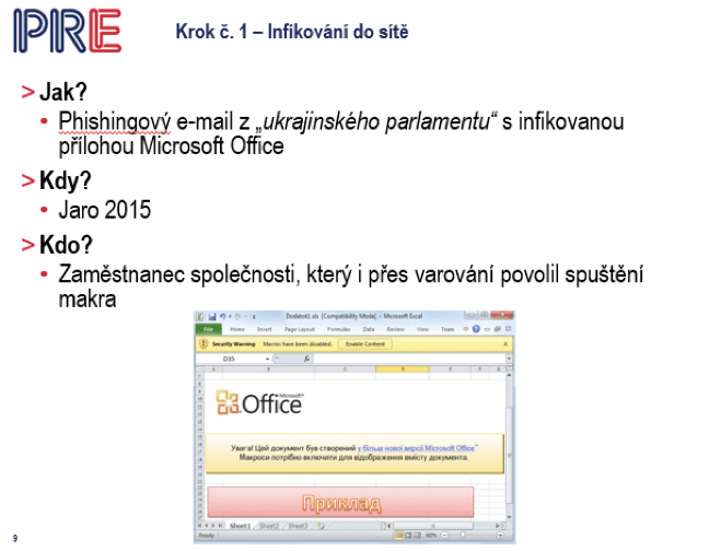 Připravil jsem si pro vás jednu případovou studii. Ono se o tom asi moc nemluvilo, ale možná to někdo z vás zaznamenal. V roce 2015 se dostala ukrajinská distribuční síť do velkých problémů. Ten útok byl zřejmě s největší pravděpodobností veden z tehdejší Ruské federace, už bylo po anexi Krymu. A ten phishingový e-mail, šel z účtu, který vypadal jako ukrajinský parlament. Na jaře 2015 zaměstnanec ukrajinské distribuční společnosti otevřel e-mail a kliknul na nějaký odkaz. Nic se nestalo, prostě asi mu to nějak zafungovalo. Nicméně ten e-mail byl infikovaný a do jeho počítače se nahrál nějaký malware, nějaký virus, který začal působit. Připomínám, jaro 2015.