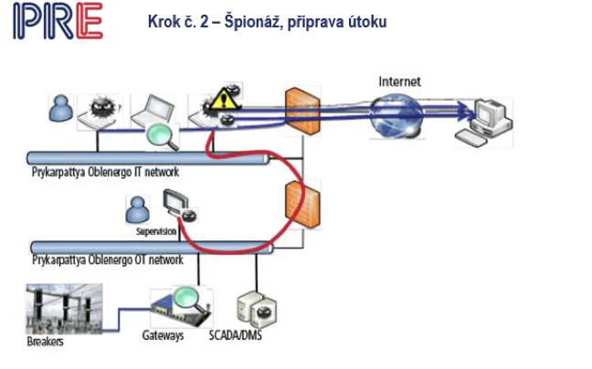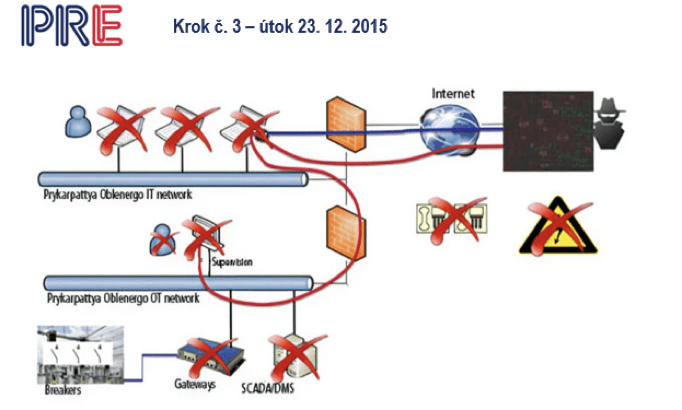 Proběhlo to zhruba takto. Z toho počítače přes internet, přes nějaký firewall – to je ta první červená zeď – se to dostalo do počítače toho pracovníka, zaměstnance. A vidíte tam takový ten hnusný obličejík, který vypadá skutečně jako virus, černý, tak ten se začal postupně šířit. Dostal se do řídicího systému, dostal se do ovládacího systému a postupně se dostal až do SCADY, což je vlastně srdce řízení distribuční soustavy. A stále se nic nedělo.