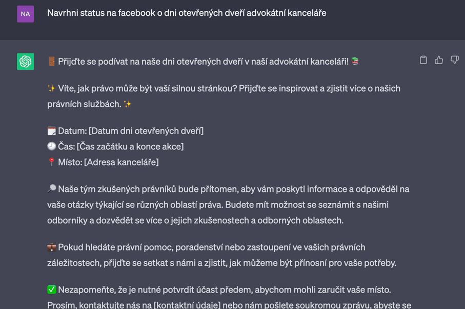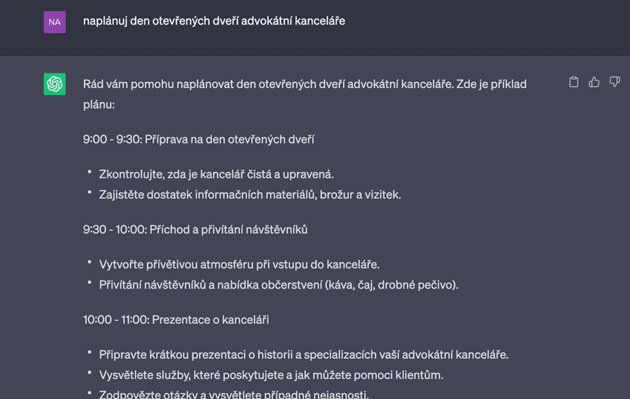 Chatbot je schopen Vám velmi ulehčit práci v oblasti marketingu. Navrhne popisy akcí, je schopen sestavit harmonogram či Vám dokonce sepsat, na co byste při plánování události neměli zapomenout. Níže na obrázku je vidět, jak ChatGPT po krátkém pokynu naplánoval den otevřených dveří advokátní kanceláře.