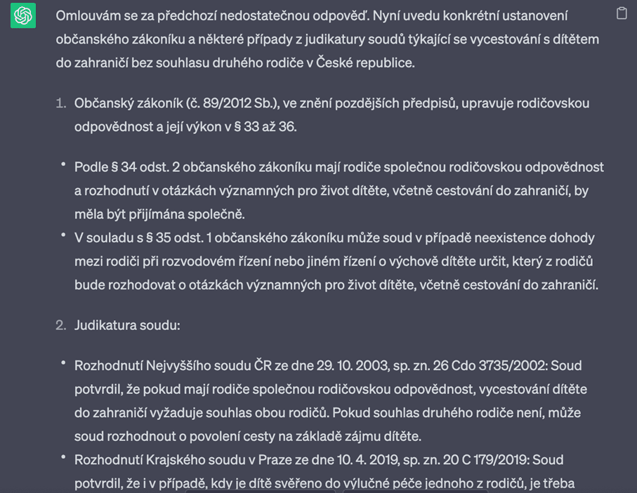 Umělou inteligenci je možné využít při tvorbě rešerší. Zde je však na místě být obzvláště opatrný a mé zkušenosti v tomto směru zatím nejsou příliš pozitivní. Umělá inteligence si totiž neváhá vymýšlet, co se jí (nebo Vám) zrovna hodí. Odkazuje na špatné §§ a v případě judikatury si vymyslí klidně i název soudu a neexistující judikát se spisovou značkou včetně závěrů, které vycházejí z Vašeho dotazu a které byste takříkajíc zřejmě chtěli slyšet. V níže uvedeném případě pak ChatGPT zmiňuje paragrafy občanského zákoníku, které však upravují zcela něco jiného než problematiku, na kterou byl dotaz mířen. Uvedenou rešerši tedy umělá inteligence nezvládla vytvořit vůbec dobře.