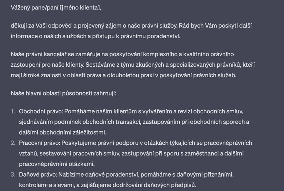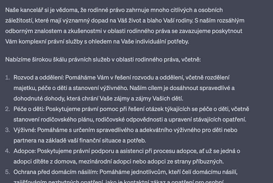 Většina advokátních kanceláří a vůbec společností celkově, má na webových stránkách popisy služeb, které nabízí. ChatGPT může pomoci s tvorbou těchto obecných a často dlouhých popisů. Stačí poskytnout odvětví či informace o službách a umělá inteligence vygeneruje atraktivní a relevantní texty užitečné nejen pro webové stránky.