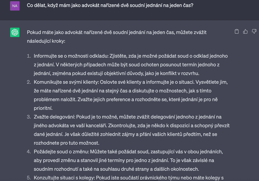 Umělou inteligenci pak můžete použít k řešení problémů téměř čehokoliv. Trápí Vás problém, který zdánlivě nemá řešení? Zkuste se obrátit na umělou inteligenci, zda Vám řešení či různé perspektivy nenavrhne. Zkusit můžete v podstatě jakoukoliv životní situaci. V níže uvedeném případě ChatGPT radí, co dělat v případě kolize soudních jednání.