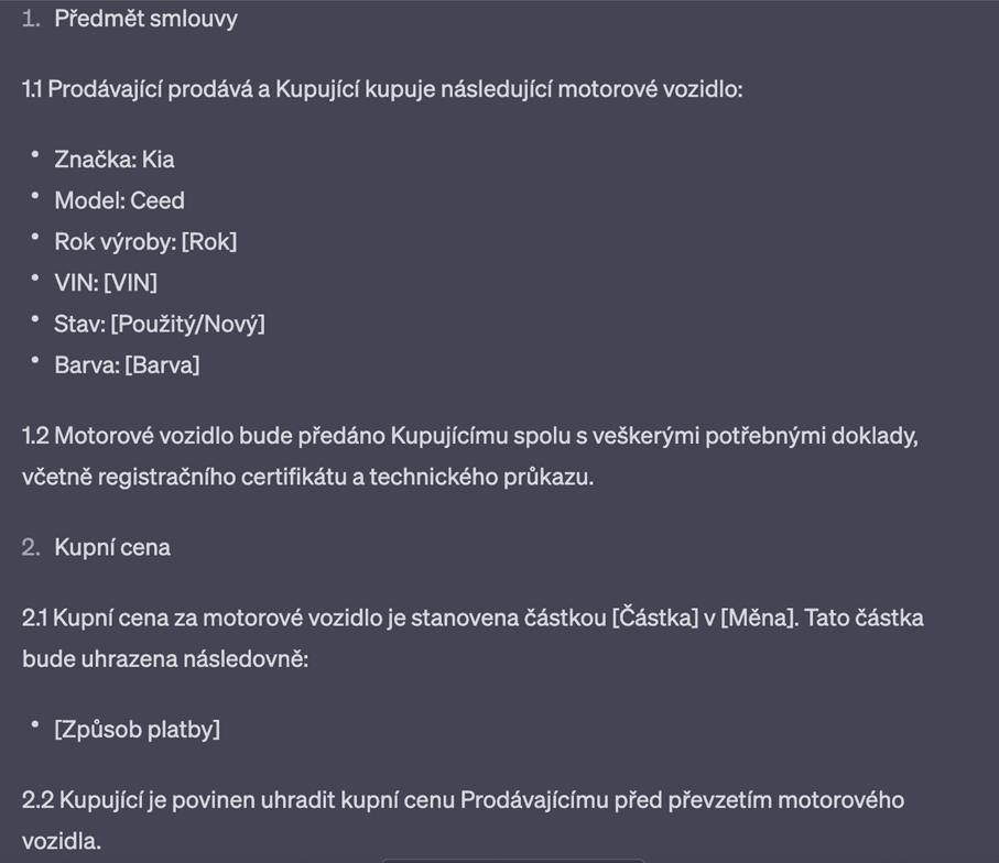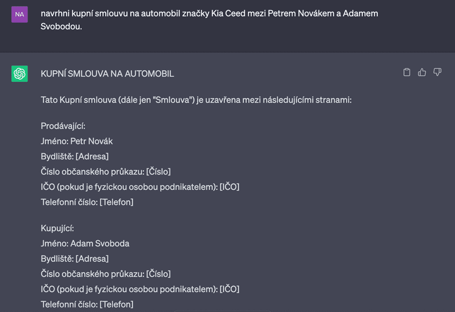 ChatGPT Vám může pomoci dokonce s vytvořením celé smlouvy, anebo pouze s formulací jednotlivých ustanovení. ChatGPT je také schopno Vám již existující smlouvy zkontrolovat. Na druhou stranu je u tvorby smluv nutné klást důraz na kontrolu textu, který umělá inteligence vytvoří. Je vhodné ji vnímat jako nástroj a její návrhy kriticky posuzovat. Nezapomínejme na to, že ChatGPT nemá právní vzdělání a nemůže nahradit odborné znalosti advokáta (zatím ;)).