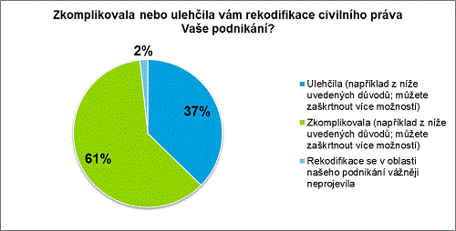 Rekodifikace soukromého práva, s níž od 1. ledna 2014 nabyl účinnosti nový občanský zákoník a zákon o obchodních korporacích, přinesla komplikaci téměř dvěma třetinám (61 %) podnikatelů. Na druhé straně představuje pro více než třetinu (37 %) respondentů ulehčení v podnikatelské činnosti. Vyplývá to z průzkumu advokátní kanceláře Ambruz & Dark Deloitte Legal, který na konci září 2014 zrealizovala mezi podnikateli na Moravě.