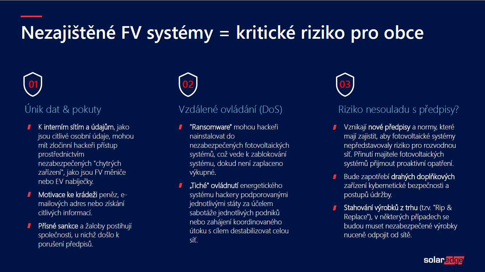Kybernetická bezpečnost fotovoltaických systémů se stává kritickou prioritou pro obce i průmyslové podniky. Jak upozornil Jindřich Stuchlý manažer společnosti SolarEdge, problém má několik dimenzí – od úniku dat až po možnost vzdáleného ovládání systémů. Reálné dopady dokládají případy z praxe, kdy ransomware ochromil firmy na týdny.