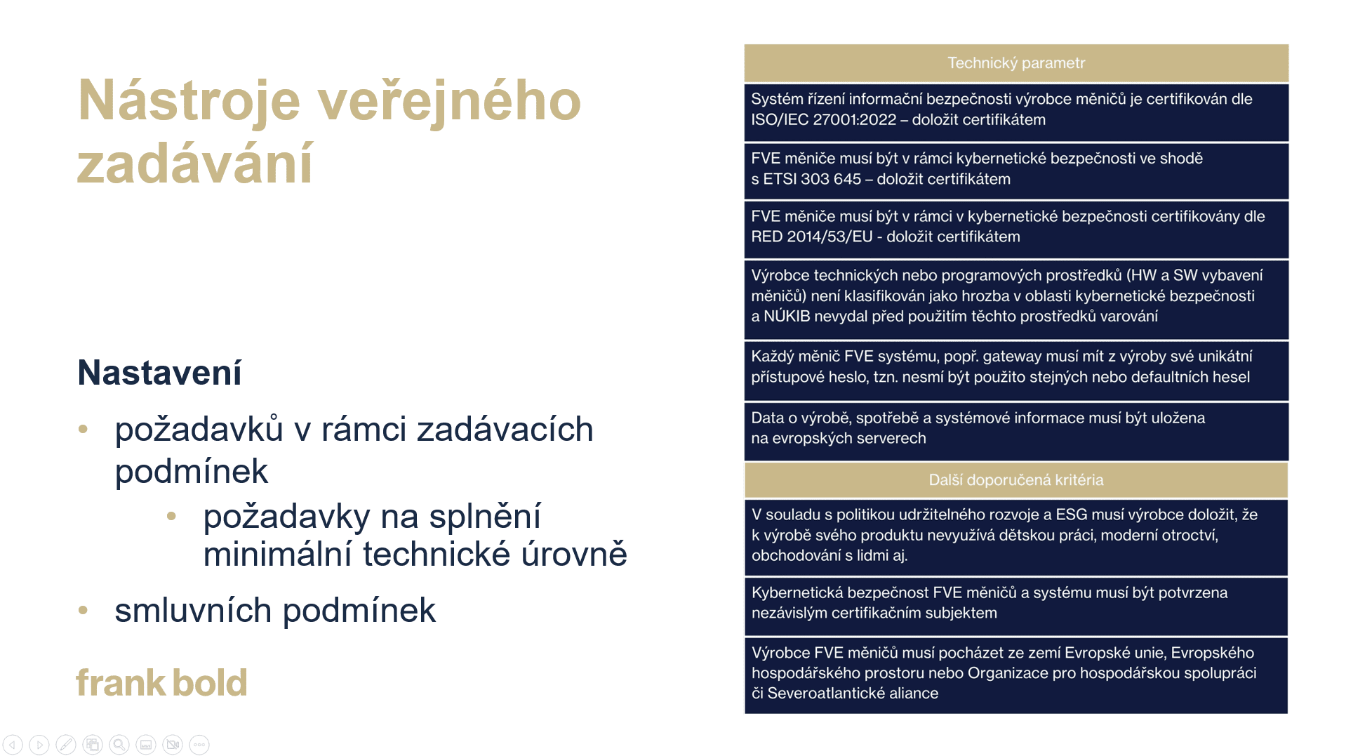Vedoucí advokátka Frank Bold Advokáti Anna Francová popsala konkrétní nástroje pro zajištění kyberbezpečnosti už ve fázi zadávání. Klíčové je využít možnosti, které poskytuje zákon o zadávání veřejných zakázek při nastavení požadavků v rámci zadávacích podmínek – konkrétně požadavky na splnění minimální technické úrovně a smluvní podmínky.