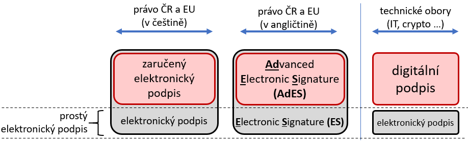 Obecně pak může být prostým elektronickým podpisem opravdu úplně cokoli, co je „z nul a jedniček“, a co někdo považuje za svůj podpis. Je tomu tak díky způsobu, jakým unijní (a tím i naše národní) právní úprava přistupuje ke svým definicím: nejprve co nejobecněji řekne, čemu všemu bude říkat „elektronický podpis“ (právě: čemukoli „z nul a jedniček“, co někdo považuje za svůj podpis). A pak definuje užší kategorii takových elektronických podpisů, kterými se teprve bude podrobněji zabývat – což jsou právě elektronické podpisy, založené na principu asymetrické kryptografie. Tedy s vlastnostmi, které jsme si naznačili výše. Mimochodem, technické obory (a třeba i právo USA) takovéto podpisy označují jako digitální podpisy. My jim velmi nešťastně říkáme zaručené elektronické podpisy (zatímco v angličtině se jim říká Advanced Electronic Signatures, doslova: zdokonalené elektronické podpisy, zřejmě s odkazem na jejich vlastnosti a použitou technologii, resp. princip asymetrické kryptografie). Mimochodem, legislativa na Slovensku skutečně používá termín zdokonalený elektronický podpis tam, kde ta naše mluví o zaručených elektronických podpisech.