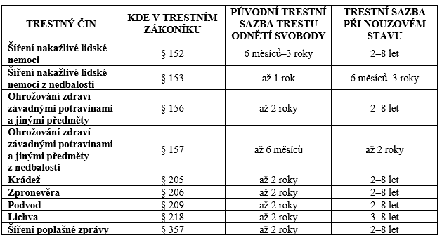 V případě nedbalostního trestného činu se trestní sazba trestu odnětí svobody, jako jediné varianty postihu v době nouzového stavu, ustanovuje na až 2 roky.