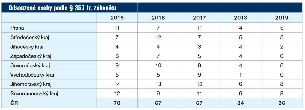 Dá se očekávat, že počty odsouzených osob v budoucnu porostou nejen kvůli zjitřené společenské atmosféře v souvislosti s pandemií koronaviru, ale také proto, že od novely zákona o trestní odpovědnosti právnických osob a řízení proti nim provedené zák. č. 186/2016 Sb. se tohoto trestného činu může s účinností od 1. 12. 2016 dopustit také právnická osoba.