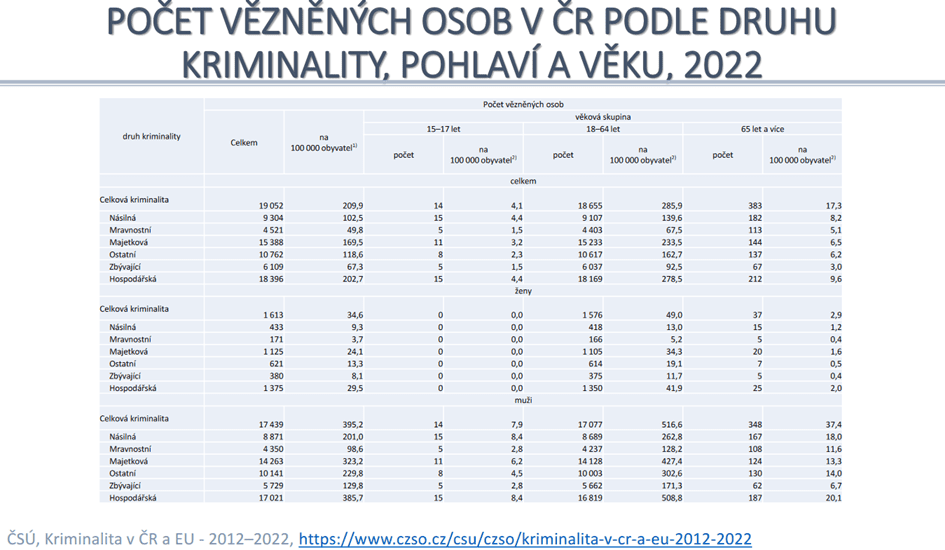 Shrneme-li potud, co tady prezentuji, tak se zdá, že ten náš přístup k trestání, který na první pohled alespoň podle znění zákona, vypadá velmi mírně, a zároveň jak se zdá, tak ty výsledky bezpečnosti pro občany nacházející se na území České republiky, jsou skvělé. Vypadá to, že jsme prostě ve vynikající kondici. Na první pohled to vypadá opravdu úžasně. Nicméně potom dorazí další tabulka, ve které taky vynikáme v rámci vyspělého světa, a to je počet vězněných osob na počet obyvatel. Tady je jenom tabulka, která snad pro zajímavost dokumentuje stále trvající velkou nerovnováhu mezi pohlavími, kdy ve vězeních je desetkrát více mužů než žen, což je taky určitě prostor pro zamyšlení. Nicméně spíš je zajímavé si všimnout, pro jaké druhy trestné činnosti tam ti lidé končí. Potom povím, proč.