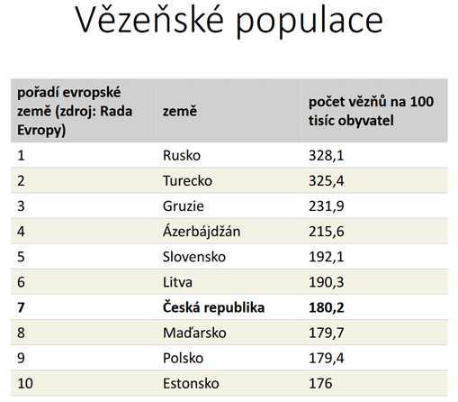 Ale všimněme si tedy zejména, jaké země jsou v popředí, a nemyslím si, že jsou to země, k nimž se obracíme jako ke vzorům fungování společnosti. A byli jsme na tom i hůř, respektive lépe, to znamená, taky jsme se i některé roky pohybovali na třetím, čtvrtém místě v počtu vězňů na počet obyvatel. Čili tady vidíte realitu, která vůbec neodpovídá tomu, co jsem říkal na začátku, to znamená, jak trestáme mírně, jak jsme povinni trestat mírně. Máme prostě obrovské množství lidí ve věznici.