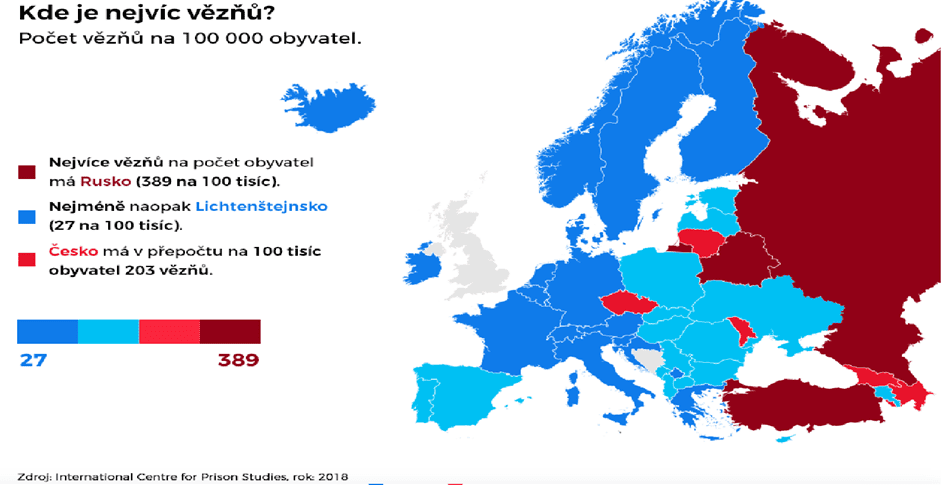 Mimochodem, takové Nizozemí nebo Německo nebo Francie mají zhruba polovinu lidí ve vězení na počet obyvatel než my. Polovinu. A když se podíváme na tuto mapu, tak si teprve uvědomíme (já jsem nenašel pozdější než z roku 2018, ale ono se to pořadí moc nemění), že my prostě vprostřed Evropy trčíme jako velvyslanec orientálního způsobu trestání oproti ostatním evropským zemím. To, že nejbližší země k nám, která má podobný počet vězňů, je teprve Bělorusko a Rusko, tak to o něčem vypovídá.