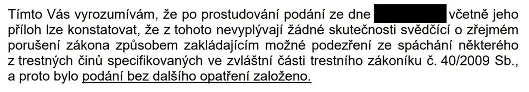 Po třech letech se nám tedy do rukou dostává další „věc uložená ad acta“, je však třeba poznamenat, že se jedná o úplně jiný druh oznamované trestné činnosti. Máme-li srovnat problematiku o níž jsme psali v roce 2020 (vícero uložení věcí ad acta s velmi chudým odůvodněním), s nynějším případem z roku 2023, tak nyní je odůvodnění relativně uspokojivé.
