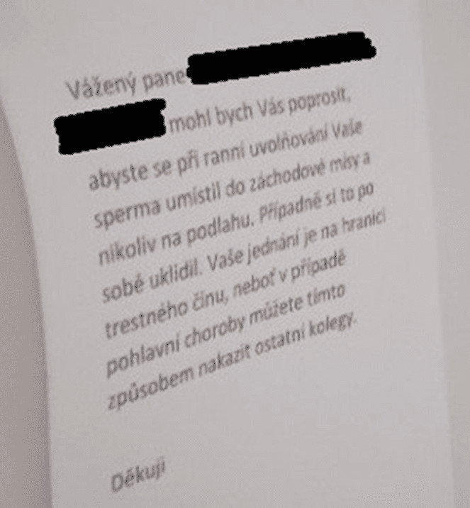 Klademe si však otázku: Nebylo to pochybení zaměstnavatele? Možná to zní zvláštně, ale zaměstnavatel v daném případě umožnil (nezabránil) vytvoření takového pracovního prostředí, resp. pracovního klimatu, kde bylo možné realizovat obscénní vyřizování účtů. Pokud i přes veškeré preventivní činnosti zaměstnavatele v oblasti vytváření podmínek pro důstojné pracovní klima, se přihodil takovýto incident, proč nebyl odhalen a kázeňsky postižen pisatel hanlivého vzkazu? Je to spíše o vnitropodnikové kultuře než o zákonných povinnostech. Zaměstnavatel se mohl Adamovi omluvit nebo mu jiným způsobem poskytnout zadostiučinění za to, že nezabránil předmětnému incidentu a ani ho zdárně nevyšetřil. Zůstává pak čistou spekulací, zda není na místě občanskoprávní žaloba na zaměstnavatele, ale to už by bylo na hlubší analýzu.