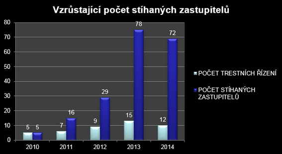 Z tabulky vidíme, jak se trestní represe zvyšovala a jak se orgány činné v trestním řízení „rozjížděly“, zejména rok 2013 a 2014 je vcelku drastický. Máme tady tudíž první odpověď na otázku, zda stoupá počet trestně stíhaných zastupitelů. Ano, stoupá. V této souvislosti bych chtěl zmínit, že zastupitelů je v České republice přibližně 60 tisíc, a stíháno jich bylo během zmapovaných let (rok 1990 až 2014) 266. Ačkoliv by se mohlo zdát, že toto číslo není vysoké, dovolím si namítnout, že já osobně bych nechtěl být jeden z těch 266, kterým trestní řízení zničilo život.