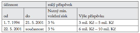Pro dosažení na příspěvek bylo nutné ve volbách do Poslanecké sněmovny získat minimálně 3 % odevzdaných hlasů, s každým 0,1 % započtených hlasů se příspěvek zvyšoval o 100 000 Kč, resp. o 200 000 Kč, po dosažení 5 % odevzdaných hlasů se příspěvek již dále nezvyšoval, což vedlo k faktickému zastropování výše příspěvku pro stranu na 5 mil. Kč, resp. 10 mil. Kč.
