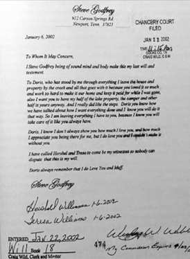 Zatímco rozhodnutí týkající se tabletové závěti, v předchozí části tohoto článku, pokládám za sympatické a umím si představit i prosazení jeho závěrů v českém právním prostředí, o následujícím rozhodnutí se totéž říci nedá. Steve Godfrey si pozval domů své sousedy, vytvořil níže nascanovaný dokument, který nepodepsal vlastní rukou, leč jako variantu zakončení zvolil své jméno vypsané na počítači zdobným fontem a kurzívou. Sousedi sehráli roli svědků. Po Godfeyově smrti soudy uvěřily svědectví sousedů o tom, že se vše odehrálo způsobem uvedeným shora, pročež tuto prapodivnou závěť uznaly za platnou. Kurzívou vypsané jméno podle nich naplňuje autentizační funkci podpisu. Poměrně paradoxní je, že ze závažnější nedostatek nežli tento „podpis“ pokládaly absenci svědecké doložky i podpisů sousedů.[2]
