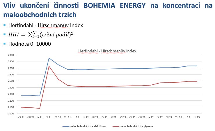 Modrá čára na níže znázorněném grafu značí maloobchodní trh s elektřinou, červená maloobchodní trh s plynem. Jak můžete vidět, předtím, než padli dodavatelé typu Bohemia Energy, pohybovala se struktura našeho trhu z hlediska koncentrovanosti pod hranicí 2500. To značilo, že trh se blíží vyšší míře koncentrovanosti, ale není to takové, aby vznikaly trhy typu oligopolu nebo tam byl dominantní soutěžitel, který může s trhem manipulovat a chovat se bez ohledu na ostatní účastníky trhu.